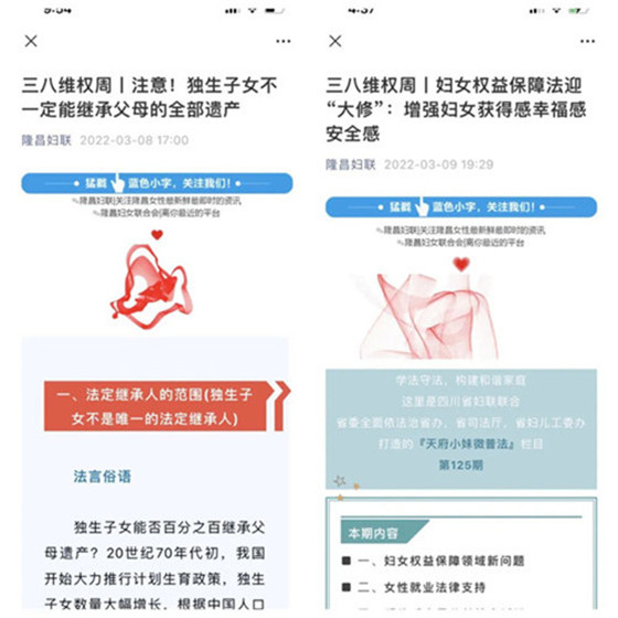 市县同步发力通过“幸福内江.甜城甜女”“市中区妇联”“东兴妇联”“等8家媒体,推送妇女儿童维权信息、安全生产、禁毒防艾等内容的普法宣传推文70余条次,阅读量累计4.8万人次,起到了很好的社会宣传作用。