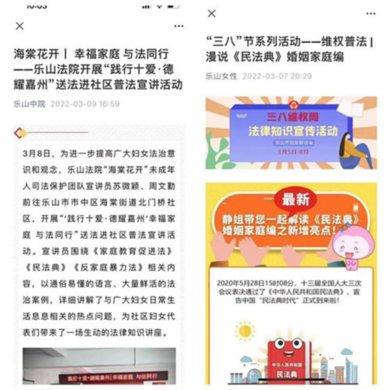 乐山市妇联联合市法院、市检察院、市司法局、市公安局、市总工会制定了《乐山市“三八维权周”法治巡讲活动方案》在全市开展法治巡讲;与市总工会联合开展“三八”维权周普法有奖竞答,宣传妇女维权普法和疫情政策法规、安全生产、禁毒防艾等相关知识;与市法院联合开设“乐法妈妈普法微课堂”聚焦家庭生活日常,从法律层面对家庭教育予以规范。
