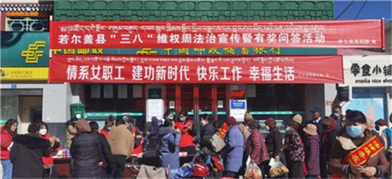 3月8日,阿坝州妇联联合州法院、州检察院、州公安局、州民政局、州司法局、州总工会、州政府妇儿工委办、州残联及马尔康市妇联在马尔康九州广场开展了“净土春晖•法治阿坝”——2022年“三八维权周”集中宣传活动。
