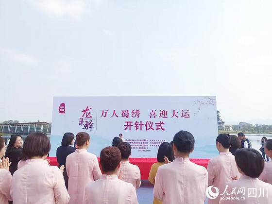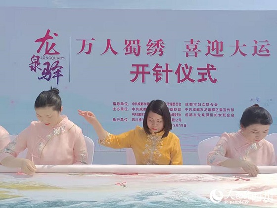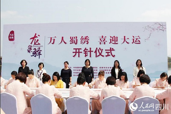 人民网成都3月18电 今日下午,成都龙泉驿区“万人蜀绣 喜迎大运”活动开针仪式在大运会主场馆龙泉驿区东安湖公园举行。此次蜀绣文化与体育盛事举办相融合的社会实践,旨在进一步拓展非遗技艺,向全世界推广四川文化。