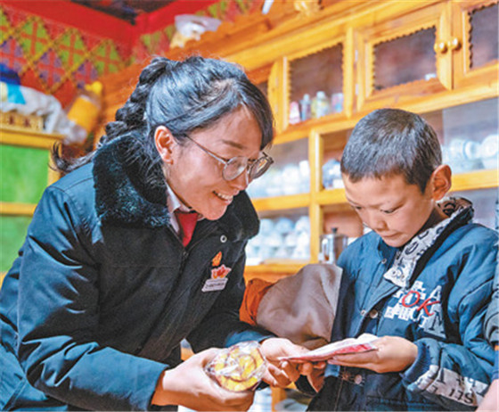 (法官泽仁曲西(左)到一名当事人家中回访,为当事人的孩子送上助学金)