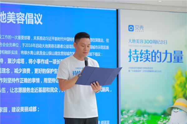 5月5日,“大地美容”项目落地成都整300周,“大地美容环境保护文明实践活动暨‘大地美容师’企业志愿服务队成立仪式”在成都友善公益园区山上·文明里举行。仪式上,成都市志愿服务联合会向贝壳找房成都站授旗,宣告“大地美容”企业志愿者服务总队及各合作新经纪品牌企业志愿者服务分队的成立,并倡议更多的市民加入项目,带动社区关注低碳生活。而自此之后,大地美容的公益时长将计入成都市文明办“文明兴蓉”平台,为积分入户加分。
