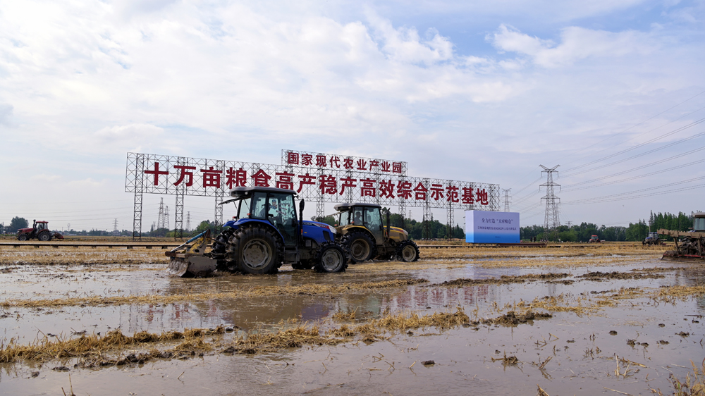 上午10点,艳阳高照,20台大型拖拉机一字排开,开始翻耕刚收割完小麦的农田,不一会儿功夫,近百亩农田翻耕完毕。紧接着,无人机开始施肥,智能无人插秧机进行插秧。