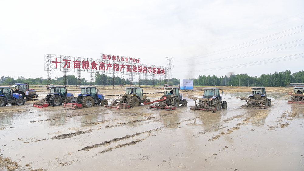 5月11日上午,在崇州市十万亩粮食高产稳产高效综合示范基地里,崇州天府粮仓国家现代农业园区2022年大春开耕仪式正式举行,成片的高标准农田里,数十台大型拖拉机、无人机、智能无人插秧机整齐有序排列,将在这里大显身手。