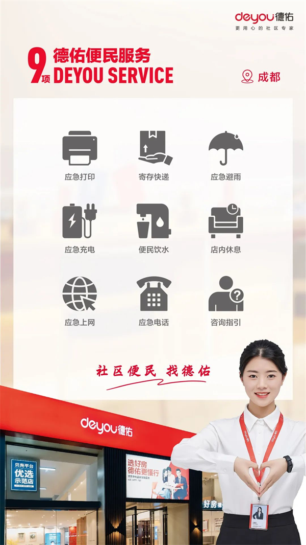 成都德佑门店提供免费打印、复印服务,早在之前已经是街知巷闻的事。早在2021年3月,成都德佑就发布最新的九大社区便民服务,全成都数百家门店可免费提供应急打印、寄存快递、应急避雨、应急充电、便民饮水、店内休息、应急上网、应急电话、应急指引等九项服务,门店成为社区便民服务的“红色枢纽”。