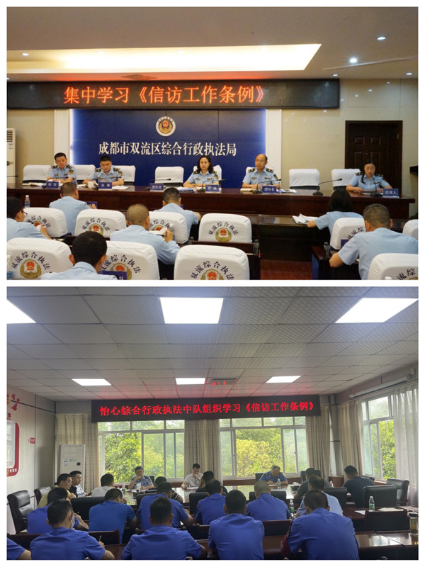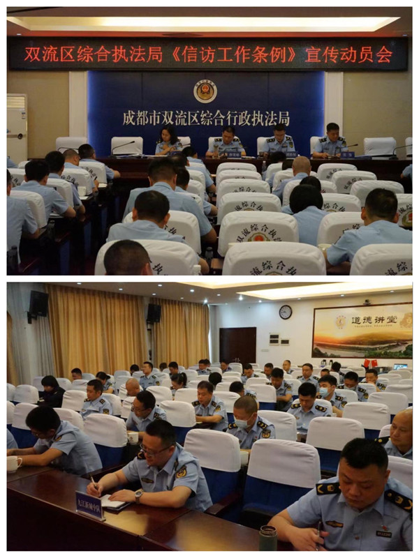 深入研究,集中学习。5月23日,双流区综合执法局召开学习宣传《信访工作条例》专题会,会议传达学习了省、市、区关于学习宣传《信访工作条例》相关会议精神,并通过“一周一学法”的形式,组织全局干部职工集中学习《条例》,并详细讲解了《条例》的出台背景、重大意义、主要内容、新旧变化等,加深了干部职工对其重大意义、适用范围、职责要求、遵循原则的理解。