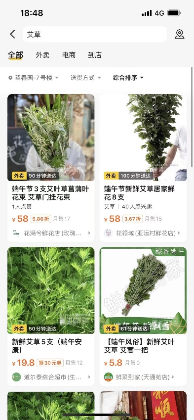 徐先生也考虑了网上购买,但又担心快递时效慢,担心端午前送不到,且收到的艾草可能不新鲜。最终,在女儿建议下,徐先生在外卖软件上下了一单,“半小时左右,外卖员便送上门了。”