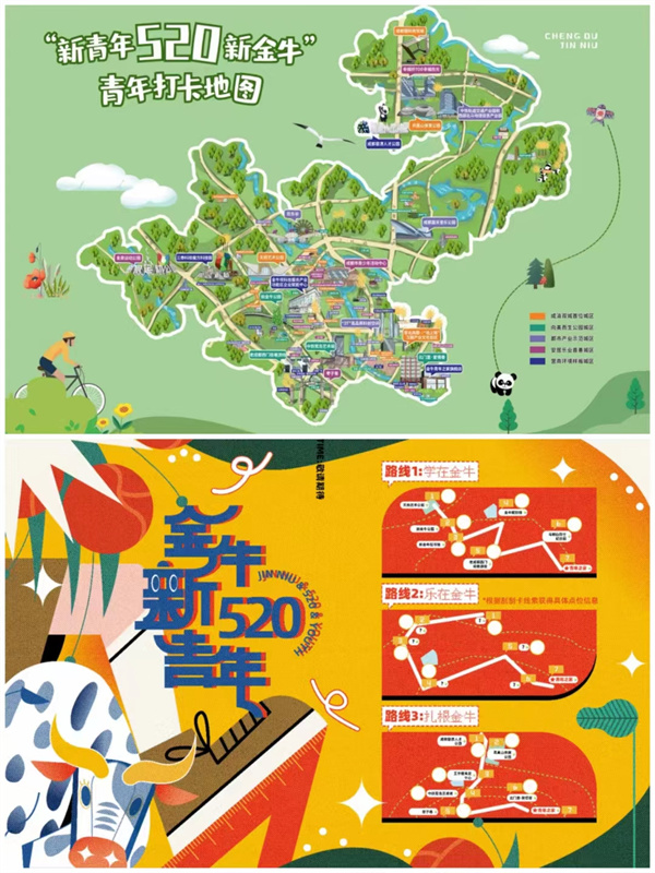 去年10月,金牛区第八次党代会上提出了“1520”总体发展思路。“1”即“加快建设天府成都北城新中心”一条主线,“5”即“着力筑牢成渝双城首位城区、向美而生公园城区、都市产业示范城区、安居乐业首善城区、营商环境样板城区”五区支撑,“20”即全面落实“五个城区”建设的二十项重大举措。此次打卡地图精选了体现“五个城区”建设的100个点位,涵盖天府艺术公园、丝路云锦、“池上锦”、枣子巷、爱情巷等公园街区。打卡活动按照地图点位规划了三条适合不同青年的打卡线路,既向青年推介金牛,让青年感受公园城市之美,也寄语新青年与新金牛共成长的美好愿景。