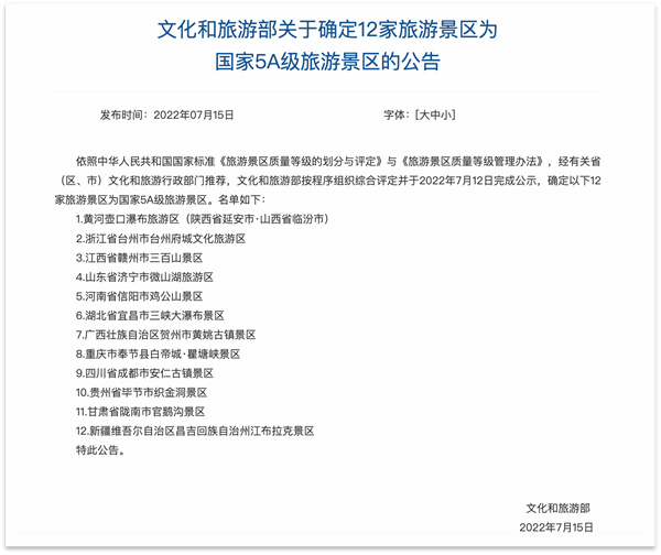 ▲12家旅游景区确定为国家5A级旅游景区公告 图片来源:文化和旅游部官网