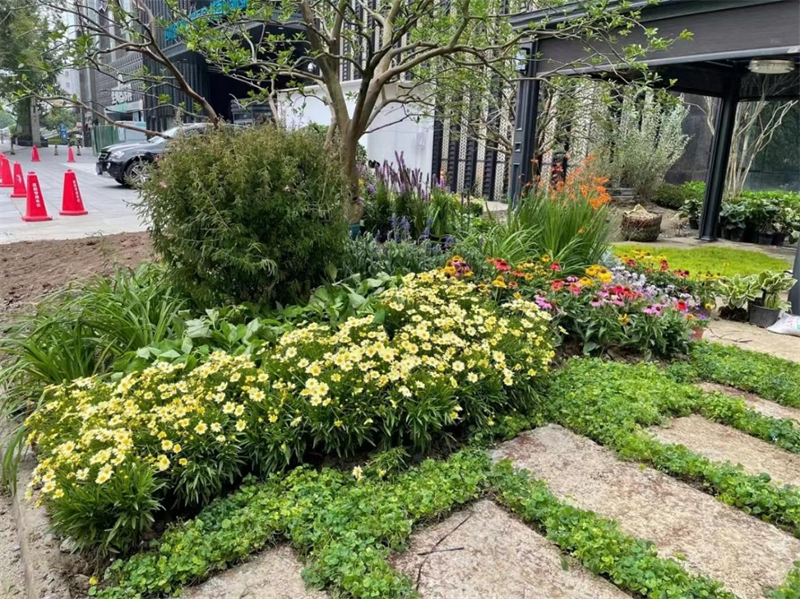 场地共运用约70余种植物,乔木主要选用胡柚、橘树、造型羽毛枫等植物,打造出内敛的植物景观空间,营造出园林之幽、园林之静、园林之雅。中下木以混合花境搭配灌木球为主,入口背景墙处以松果菊、佛甲草、山桃草等植物搭配出自然野趣的小景,展示出植物不加修饰的旺盛生命力。内部花园主要选用金叶满天星、熊猫堇、金鸡菊、鼠尾草、松果菊、绣球等植物打造多面观的自然花境景观,春夏之季,油绿、麦黄、桃粉、蓝紫一团团的色彩相互交错,柔和和谐,层次丰富,犹如成都街头的“莫奈花园”。