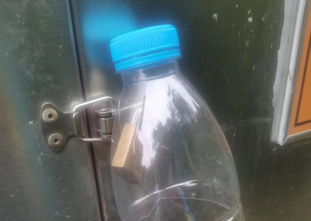 绵广高速剑门关加油站,站长赵辉裁剪废旧矿泉水瓶,做成保护帽戴在户外锁具上,为锁具遮风挡雨,让锁具半年一换的生命周期延长至“半永久”。
