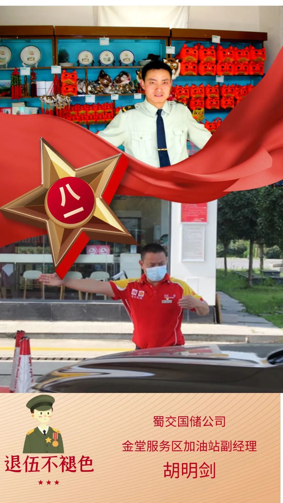2015年12月,在部队立过一次二等功、三次三等功的胡明剑转业来到了蜀交国储公司,7年来,他凭着军人的执着和坚韧,脚踏实地立足本职岗位开拓进取,用自己的实际行动书写了一名复转军人投身于成品油销售行业的新篇章。在加油站,胡明剑拿出在部队说干就干的作风,将部队的优良传统融入油站日常管理,通过开展除草、刷漆,小维修、整理内务,使加油站整体面貌焕然一新。同时他还认真学习业务知识、安全规程,将部队油库的专业知识和工作经验带入到加油站日常经营中,使站内规范安全管理水平不断提升。