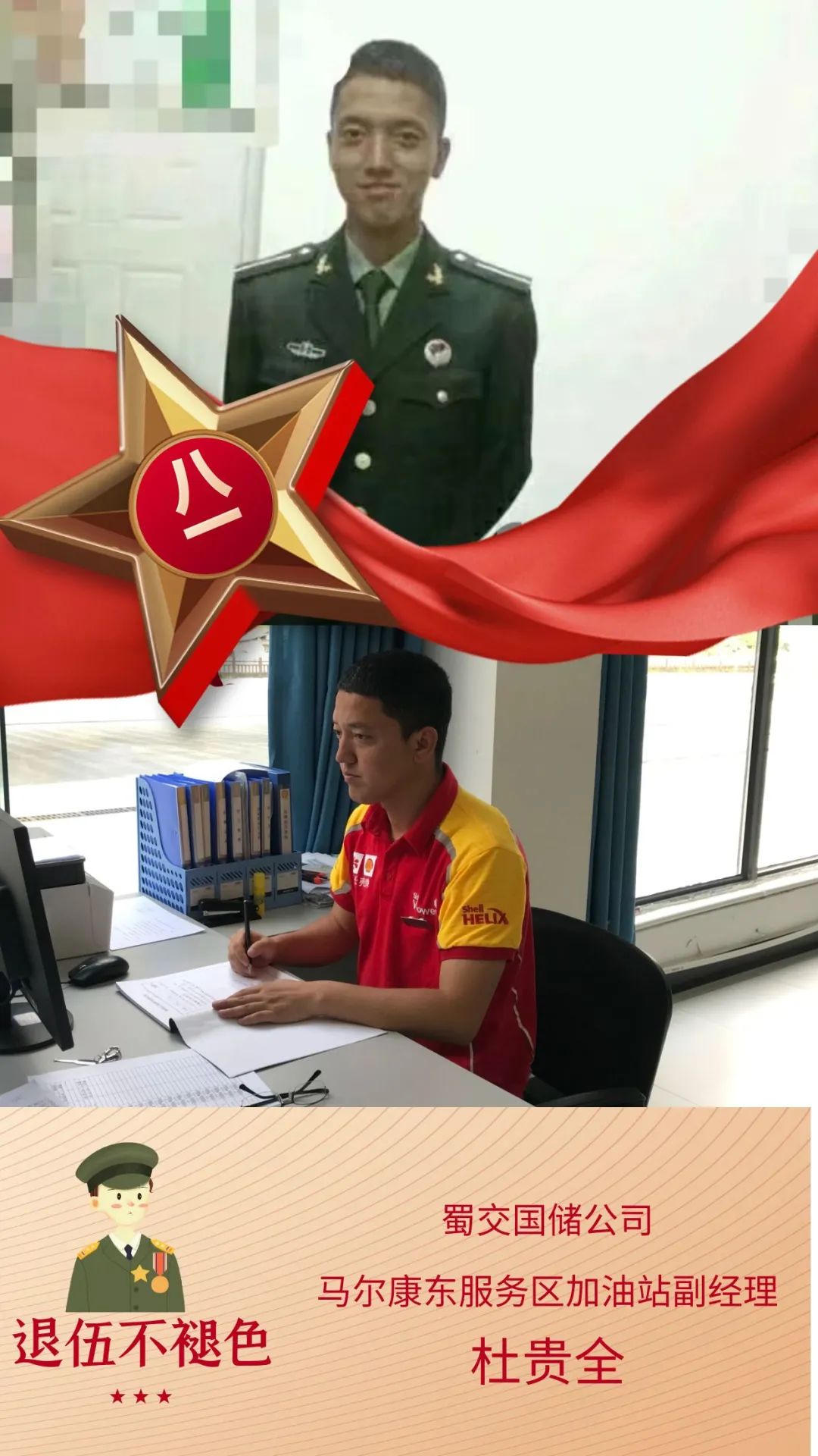 在蜀交国储公司马尔康东服务区加油站有这样一位站长,皮肤黝黑,但总是露着纯真的笑容,他就是杜贵全。杜贵全是一位退役士兵,多年的军旅生涯造就了他特别能吃苦的精神,这也使得他很快就适应了工作环境,并融入了油站大家庭。在日常工作中,杜贵全充分发挥管理人员带头示范作用,公司开展开口营销活动,他一马当先,带头在现场交流开口营销方法,个别员工由于害羞不敢对顾客开口,他就在加油时站在员工身边提醒员工开口。杜贵全还是油站设备维修小能手,因为他力气大,肯动脑,善钻研,站里凡是有需要维修的东西都会第一时间找他,不管是加油机更换配件,还是水管堵塞,他没有一样不会的,慢慢下来,既提高了自己的动手能力,也节约了一笔不小的维修费用。脱下军装,换上加油员的服装,杜贵全依然保持着军人的信念与信念。改变的是职业,但不变的是敢于奉献敢于担当的精神!