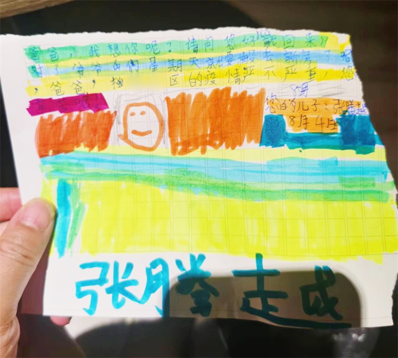 儿子用稚嫩的小手写了一封家书,遇到不会写的字就用拼音代替,用五颜六色的色彩涂满了家书。