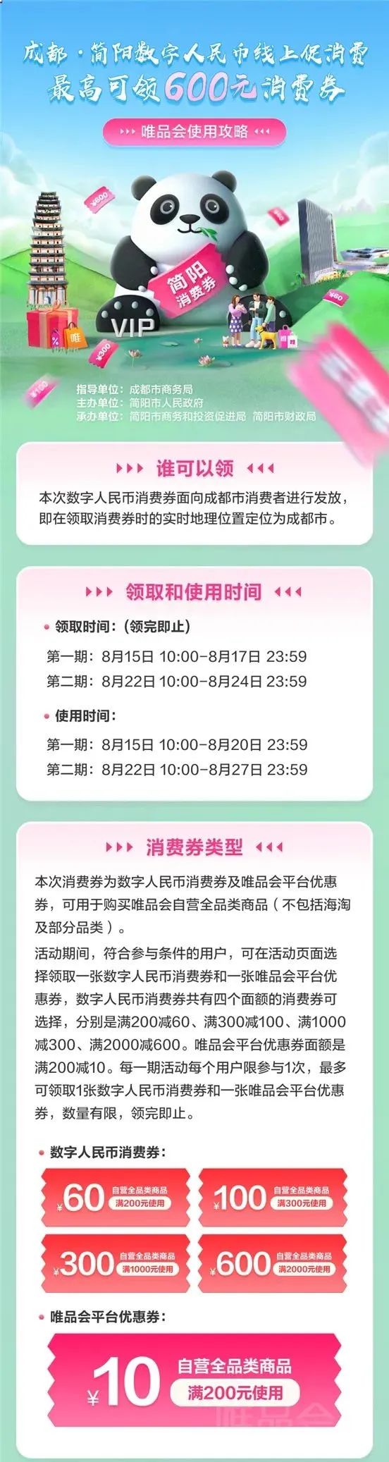8月15日10:00-8月17日23:59:59,8月22日10:00-8月24日23:59:59,简阳市政府将联手唯品会开展“相约简阳·唯品惠民”数字人民币促消费活动,分两期派发千万数字人民币消费券。