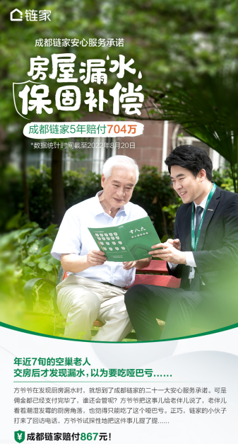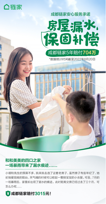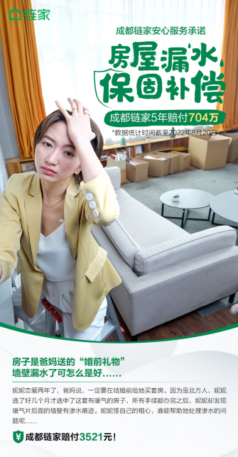 据成都链家的官方数据显示,自此项服务承诺推出以来,截至2022年8月20日,5年内共为2096位购房客户进行了漏水、渗水维修补偿,补偿总金额高达704.21万元。由于漏水、渗水问题的特殊性,这2096位客户中,85%都是在过户3个月以后才发现的问题。其中,有年轻的小夫妻,有单身女孩,也有年近七旬的空巢老人,成都链家在接到反馈后,均按照服务承诺中的赔付标准,为他们进行了维修金补偿。