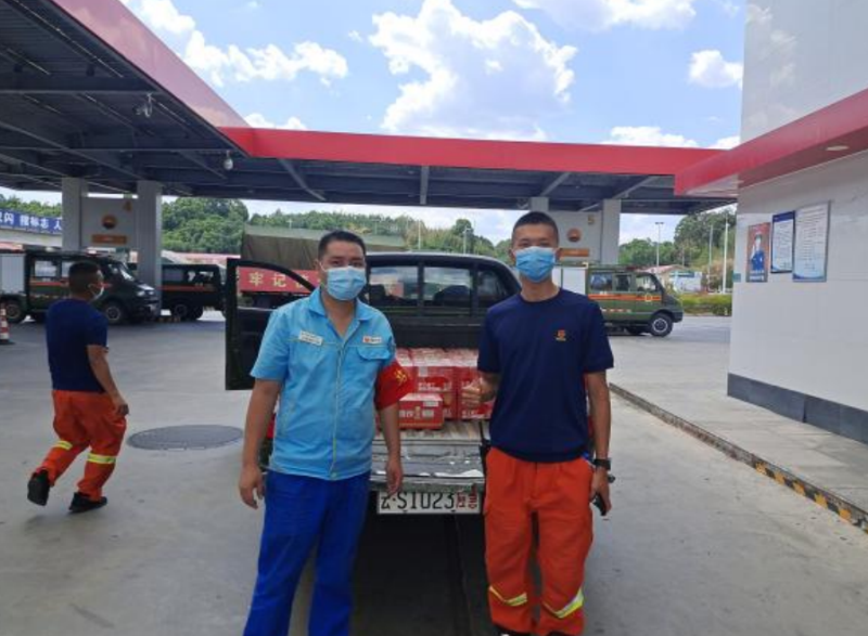 救援车辆抵达服务后,叙永加油站立即开启绿色通道,调配加油站工作人员,争分夺秒,在第一时间为救援车队开展加油服务,尽力减少救援车队停留时间,为车队争取宝贵的路程时间。暑热高温,为了给救援人员送上一丝清凉,蜀交中油公司向车队赠送防暑饮品26件,为救援工作尽绵薄之力。