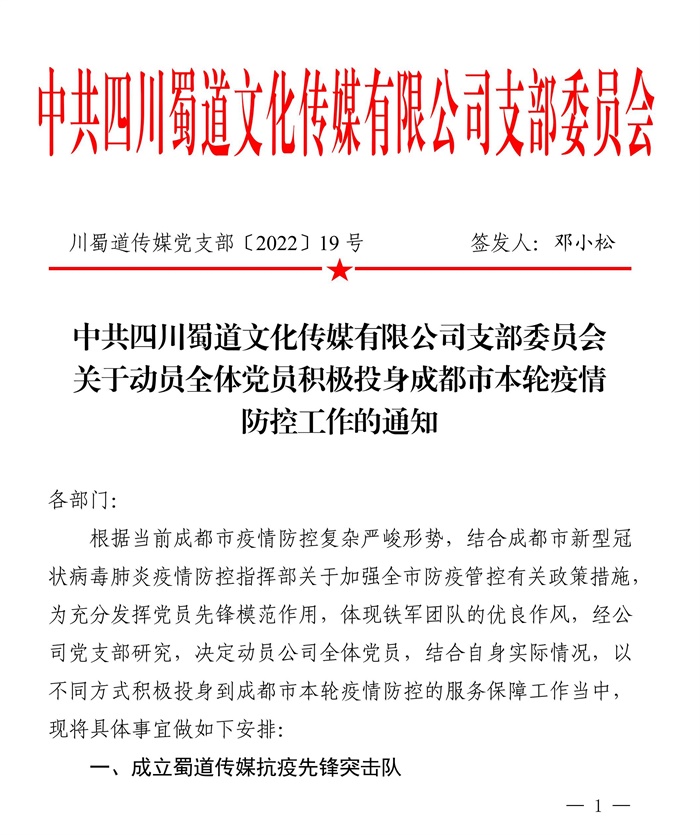 成都市“8.25”本土疫情发生以来,蜀道传媒公司发挥文化传媒企业办公较为灵活的优势,通过分时错峰上班,线上办公等方式确保发展不断、经营不乱,并动员广大员工切实做好个人防护。9月1日成都市进入“原则居家”状态后,蜀道传媒公司党组织庚即打响党员参加社区志愿服务“发令枪”,第一时间向公司全员印发《积极投身成都市疫情防控志愿服务工作的通知》,公司支部整编入列加入疫情防控队伍,全体党员化整为零到所在社区报到请缨,组建蜀道传媒抗疫先锋突击队,到最需要人的社区一线关口亮身份、拿行动、显担当。
