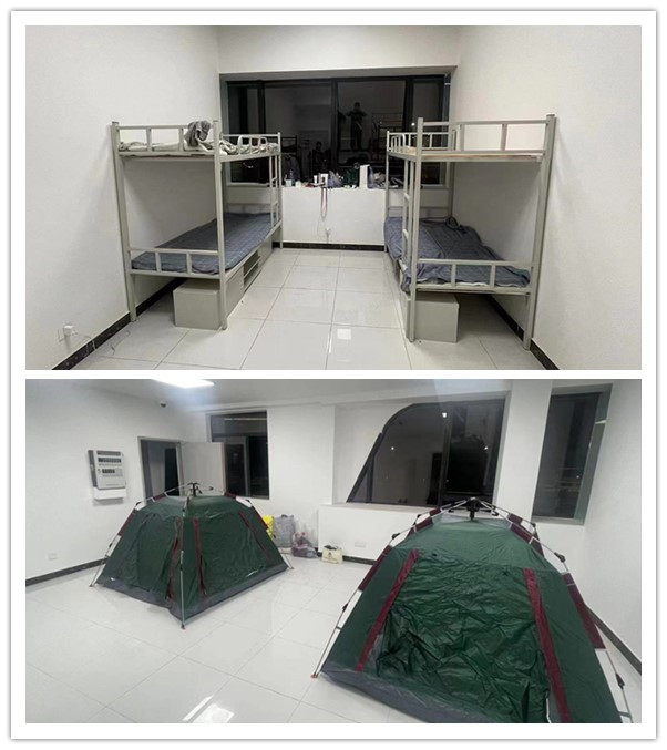 天府机场飞行区加油站只有一个值班室且没有食堂,保障员工的吃住问题,成了当务之急。站长徐勇带领员工及时整理出航站区加油站二楼办公区域,利用油站应急物资,搭简易床和帐篷,解决站内员工的住宿问题;协调机场内部单位统一订餐,保证员工的基本生活需求。同时积极协调医疗急救部,组织全体工作人员于21点前完成核酸检测,协调机场内部制定人员进出飞行区路线和时间,为机场内部车辆油品保供工作做好充分准备。