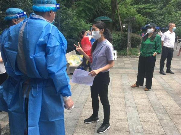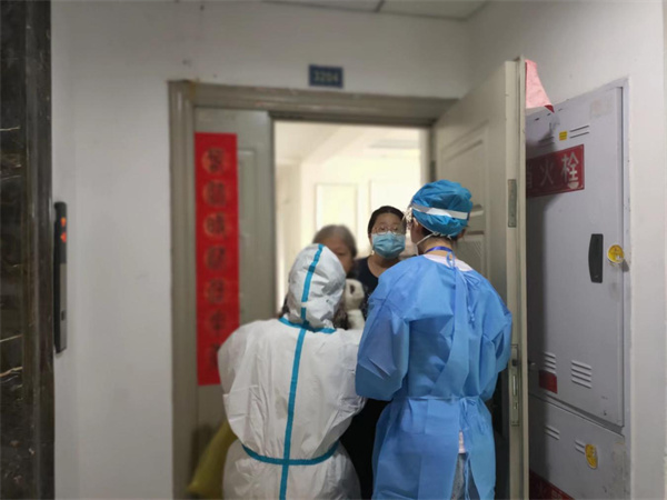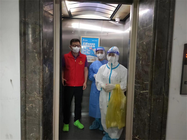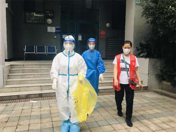 在东苑某小区一位居民已怀孕8个月,近几天下楼较为困难。得知情况后,该小区现场负责人胡丹迅速决定,由网格员邓桂英和3位志愿者组成采集小组,上门服务。采集小组闻令而动,首先联系该户居民,确认目前状态,随后穿戴好防护装具,清点好采集用品迅速出发。