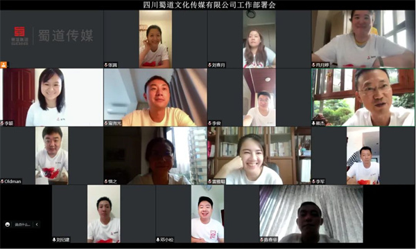 创造“仪式感”。清晨,综合部分享一些简单易学的室内健身操、有氧运动等资料,帮助大家唤醒身体机能、激活内在能量,以良好的精神面貌投入工作。线上视频会议期间,参会人员统一穿着“蜀道传媒”定制版文化衫,即便距离相隔,也能“列队整齐”、同袍一心。