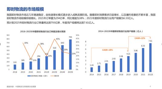 报告指出,即时物流行业最初以服务餐饮外卖行业为主,经过数年的发展已经拓展出更多品类与业务类型,在居民可支配收入提高、消费能力和消费意愿增强的背景下,伴随流量多极化趋势与即时履约能力的提升,即时物流服务范围逐步覆盖全场景、全距离、全时段,成为即时零售不可或缺的新基建。在即时零售、跑腿等“非餐饮”新增长点驱动下,即时物流市场规模持续增长。数据显示,2021年即时物流行业订单量为294亿单,同比增速为38%,用户规模为6.33亿人;预计到2025年即时物流行业订单量将达到793亿单。