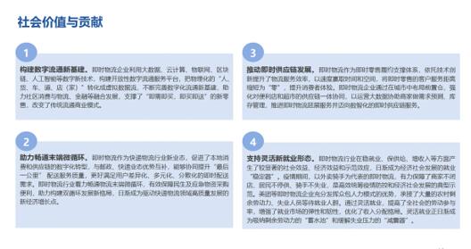 在助力实体经济方面,近年,即时物流企业不仅拓展了本地实体门店服务范围,还通过在城市中布局前置仓,强化对便利店和超市的供应链一体协同,以运营大数据协助商家做需求预测、库存管理,推动实体经济尤其是中小微实体门店稳定复苏增长。今年1-7月,美团平台上的便利店和超市的交易量同比增长54%,其中夫妻小店增幅达110%。报告预测,未来即时物流行业未来将进一步向产业带上游延伸,逐渐深入到整个生产供应链领域,为消费者、商家、相关行业等提供全链条数智化即时物流服务及即时供应链解决方案。