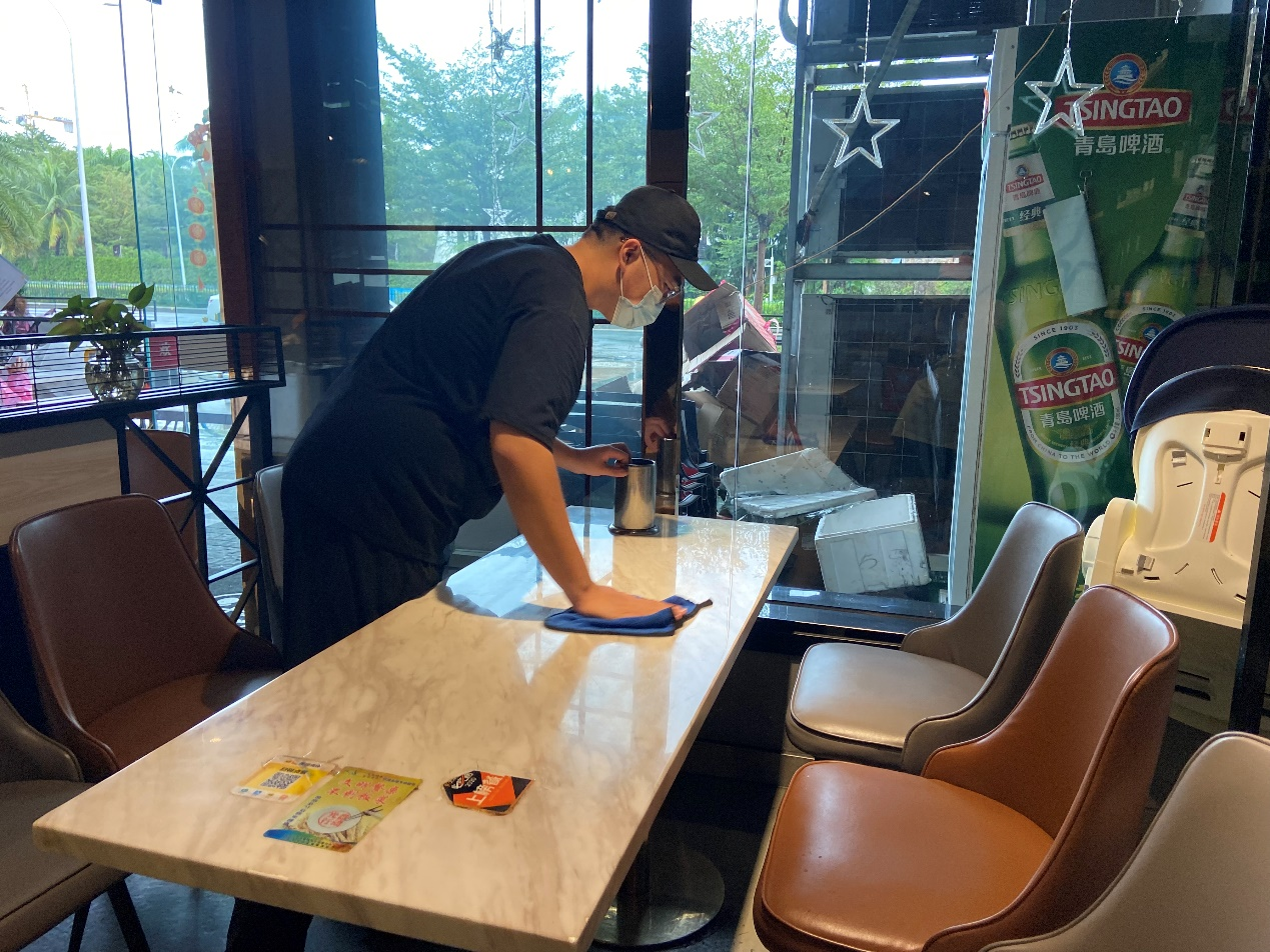 ▲巛仨·辣小馆员工正在店内打扫卫生,图片来源:商家提供