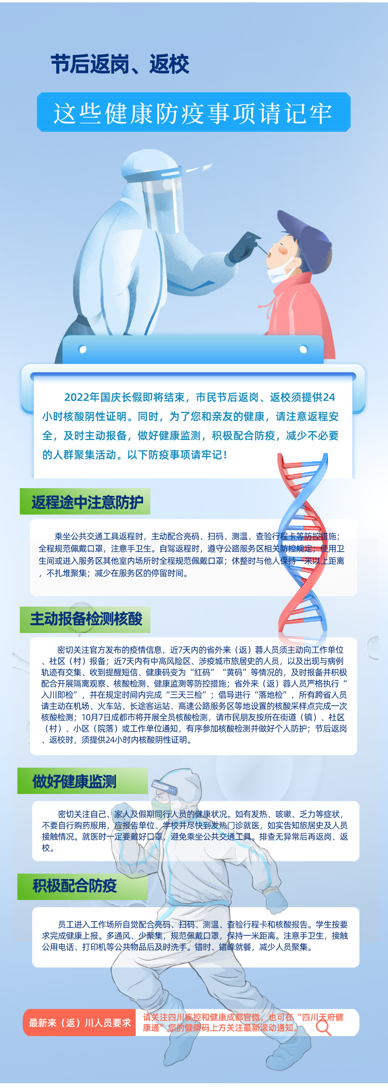 2022年国庆长假即将结束,市民节后返岗、返校须提供24小时核酸阴性证明。同时,为了您和亲友的健康,请注意返程安全,及时主动报备,做好健康监测,积极配合防疫,减少不必要的人群聚集活动。以下防疫事项请牢记!