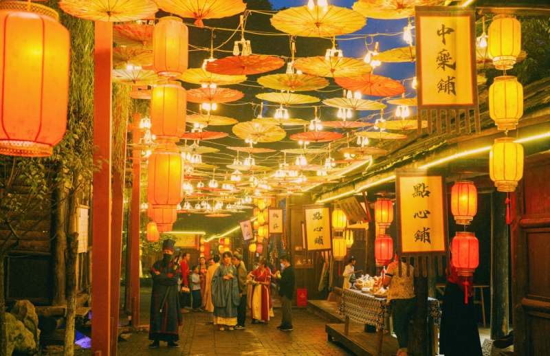 据了解,蜀州夜市的商业管理与传统的景区和夜市截然不同,开创了“剧本娱乐+文旅+商业”联动消费模式。景区管理方专门为商户提供了“定制品牌故事、定制冠名赛事活动、沉浸式互动基础培训、参与景区演艺秀”等四项内容服务,围绕《蜀州梦华录》剧情,根据商户业态、品牌特色与自身需求,结合历史传统、名人典故,进行品牌故事再包装、再创新,并融入梦华录夜市“世界观+故事线”,将商户人员也都变为故事角色与游客互动,实现剧本游戏、互动娱乐、沉浸演艺秀与商业的多向导流。