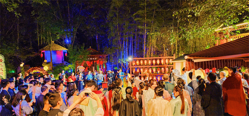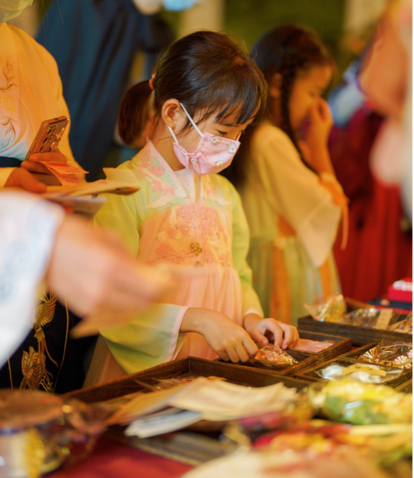 不仅有剧本游戏贯穿夜市游玩的全过程,更有雅致香道、点茶百戏、唐宋雅乐、点心菓子、演艺戏剧、诗词歌赋等非遗文化体验内容。夜市里,古乐器演奏家、著名诗人陈大华用乐曲展示着古乐器尺八的魅力;周记长春荣茶行的“街子小兰花”馥郁芬芳,曾获第八届四川国际茶博会金奖;雅道清心香气文创机构的香道文创产品,在今年中国特色旅游商品大赛上获得全国铜奖……