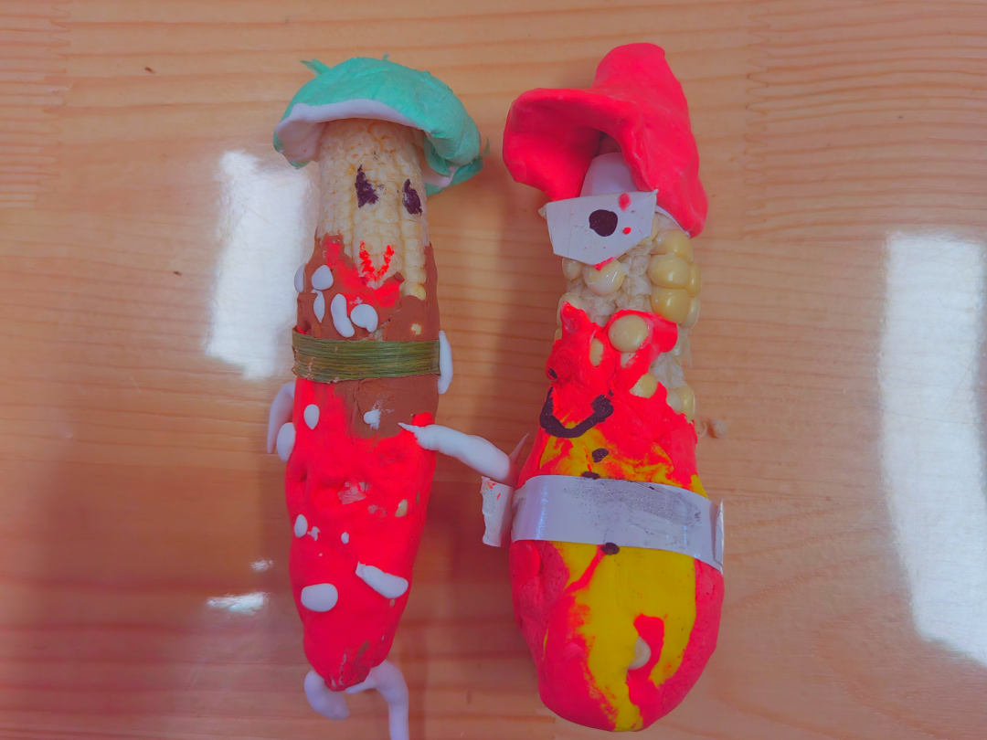 孩子们用玉米粒,玉米叶等等,还进行了手工制作,有蜗牛、小女孩、怪兽等等......