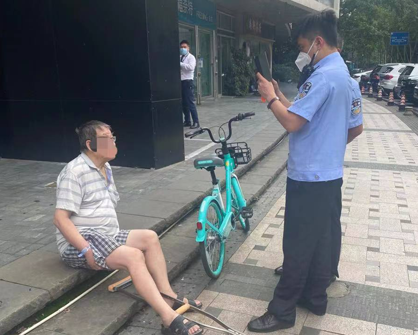 等缓了一阵,在对链家两个小哥表示感谢后,老人自顾自拄着拐又朝街对面走去,但没走几步,老人又是一个趔趄,所幸旁边停得有共享单车,老人撑了一下,才没再摔一跤。