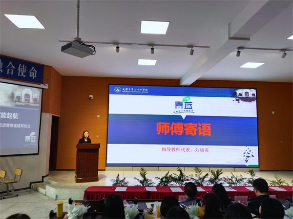 正高级语文教师刘晓英作为师父代表发言。她感谢学校和年轻教师们的信任,她说青年教师是学校的未来,是学校可持续发展的决定性因素。因此指导老师要严谨认真尽力毫无保留帮助徒弟,和青年老师互相学习。同时也希望青年徒弟教师更勤勉一些不怕吃苦,对自己有更高的期待。