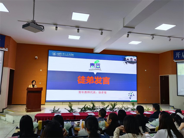 徐孝菊作为徒弟代表作了发言。她向关注新教师成长的学校领导和师父们表示感谢和敬意,并表示将努力做到摆正位置,敏而好学;勤学苦思,持之以恒;勇于担当,砥砺前行。