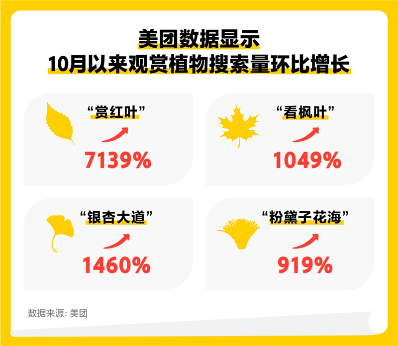 秋天浓郁的主色调,少不了枫叶红和银杏黄。美团数据显示,10月以来,“赏红叶”搜索暴增7139%,“看枫叶”同样迎来搜索高峰,较9月环比增长1049%;“银杏大道”搜索环比增长1460%。