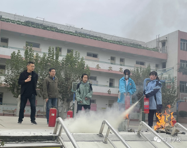 学校部分教师、学生和食堂工作人员在学校安全办老师的指导下学习了灭火器使用方法并现场操作。
