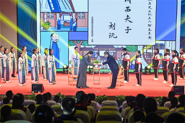 舞台上一幕幕的感人瞬间与暖心场景,也持续引发着情感的共鸣。舞台剧最后,双流区还借助穿越现场的刘沅之手,将手绘绘本《川西夫子刘沅》送给如今双流的学子,这也标志着“历史文化名人绘本”进校园相关活动正式启动发布。