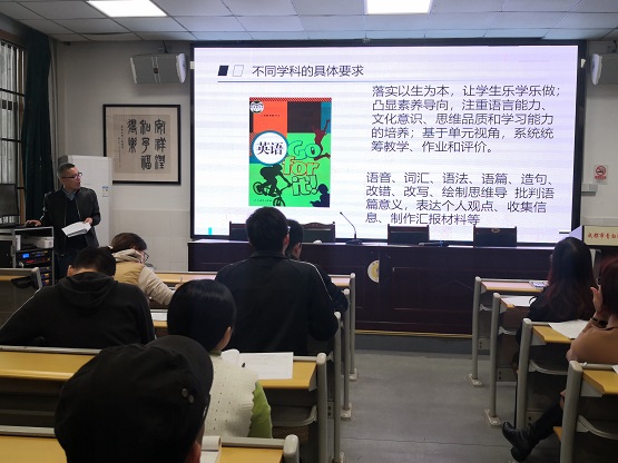 教科处副主任兰启彬的发言主题为“‘和’科研之事 ‘乐’教研之实”。他给老师们重点分析了作业之局如何破,还带领大家进行科研工作经验交流。兰主任强调作业的布置要基于课程视域,凸显素养导向 ;立足单元统整,树立系统观念。针对不同学科的特点,他给出了具体的建议。此外,他还就科研工作的具体步骤和五大热点主题给大家做了详尽的介绍。