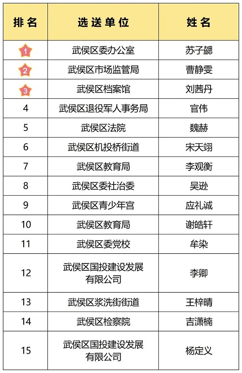 经过两天的激烈角逐,第三届青春讲解员复赛已全部结束,在大赛组委会专家的严格评审下,复赛综合成绩排名前15名的选手进入总决赛。接下来,主办方还将邀请专家就讲解技巧、讲解仪态对进入总决赛的选手进行专业培训,进一步提升选手们的讲解水平,帮助武侯青年更好地讲述武侯故事、传播时代声音。