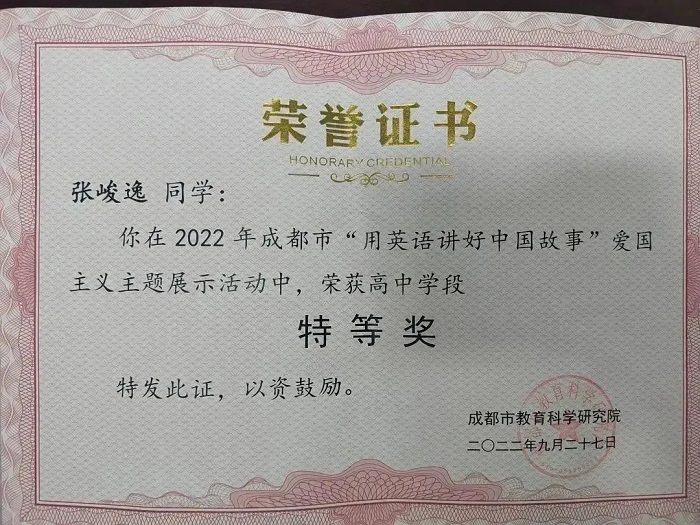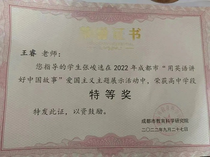 指导老师王睿在张峻逸同学的比赛筹备中付出了不少心血,逐字练习发音和吐字,力求在比赛中做到最好。经过金牛区初赛、成都市复赛,张峻逸同学获得成都市特等奖的好成绩并代表金牛区参赛,最终在决赛中荣获四川省一等奖。