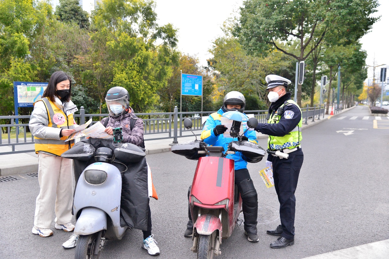 交警和骑手代表正向市民普及交通安全知识(摄影:庾永波)