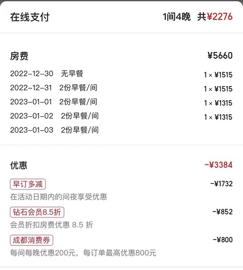 北京的徐女士在抢到成都住宿消费券后,顺势也把跨年计划定到了成都。她在美团下单了凯宾斯基饭店,为了享受“满2000-800元”的最大额度,她选择连订四晚,最终每晚500元左右的折后价也让徐女士直呼“划算”:“在享受商家优惠和平台优惠的基础上,还能额外享受政府消费券的折扣,太惊喜了,更何况这个价格还包含每天两份早餐。”
