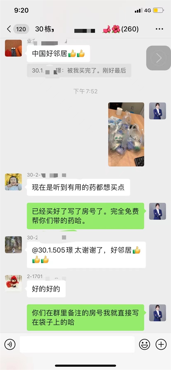 “群里还有人需要药吗?我工作地点的药店刚刚到了一批药,需要的把药名和数量发给我,我帮你们买!”王璟在业主群里发出了这样一行字。短短十分钟,已经收到了十几条求助信息。王璟将求助信息一一记录,到药店里购买并一份份分装好,做好标记并用酒精做好消杀。下班后,她便驱车10公里回到高新西区自己居住的小区,将分类好的药品挨家挨户地送到邻居手中。