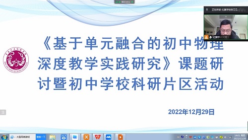 红旗学校教学课程中心副主任贺江江代表物理课题组,从课题界定、实践研究和成果提炼三个方面进行了主题汇报,结合具体教学案例,向参会教师介绍了单元融合背景下的初中物理“三深两层”深度教学模式及策略,提出深度教学由深度备课、深度体验和深度目标三个部分组成,并从理念认识和操作实践两个层次提出了具体的实施策略。