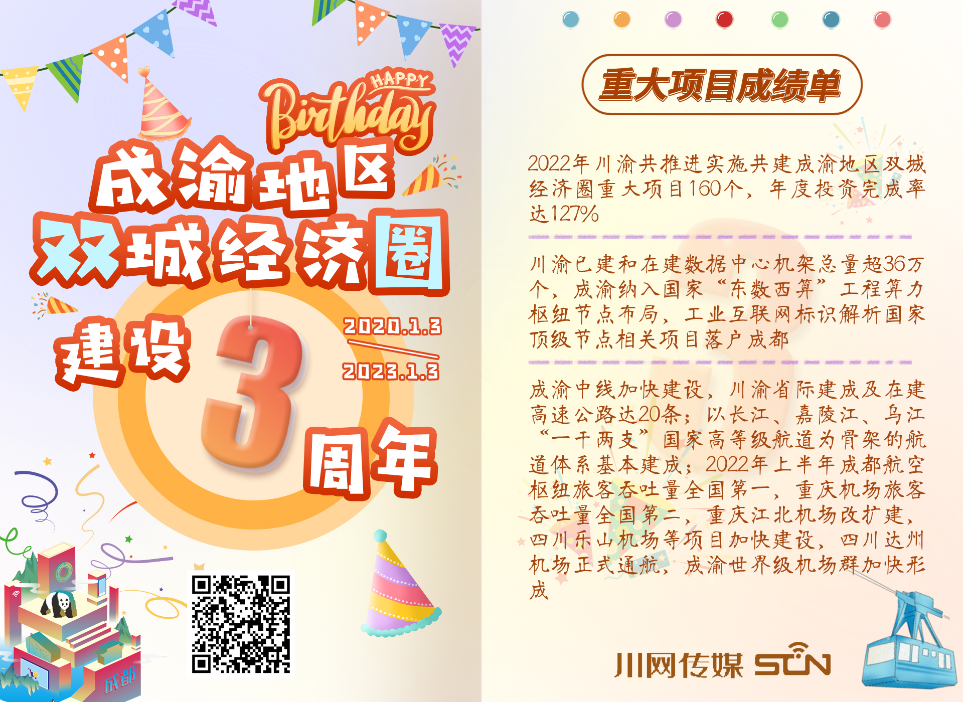 三年来,双城经济圈建设全面起势、整体成势。一张张规划蓝图相继变成路线图和施工图,一个个重大项目变成了惠及两地的实在利好。俯瞰川渝各地,从热火朝天的基础配套工程,到提升城市品质的交通枢纽,再到加速起航的新兴产业,一幅幅热火朝天的建设画卷绘就而成。数据显示,2022年川渝共推进实施共建成渝地区双城经济圈重大项目160个,年度投资完成率达127%。
