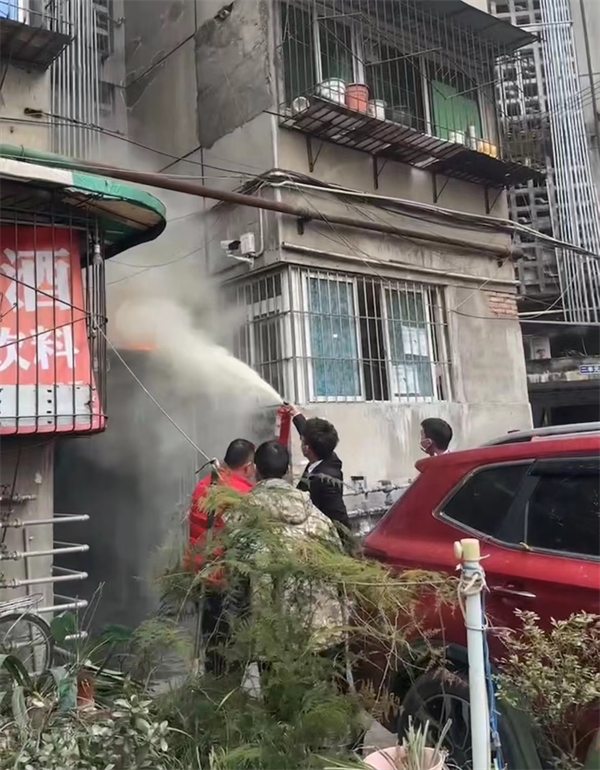 来到现场,敬江涛看到起火点位于单元入户大门房顶平台上,当时火势已有七八十厘米高,小区属于老小区,设施较老旧,平台上各种管线密布,不远处小卖部的塑料店招,楼下又停放了汽车,如果火势蔓延,后果不堪设想。话不多说,两人又是泼水,又是喷灭火器,迅速将火情扑灭,阻止了火势蔓延。
