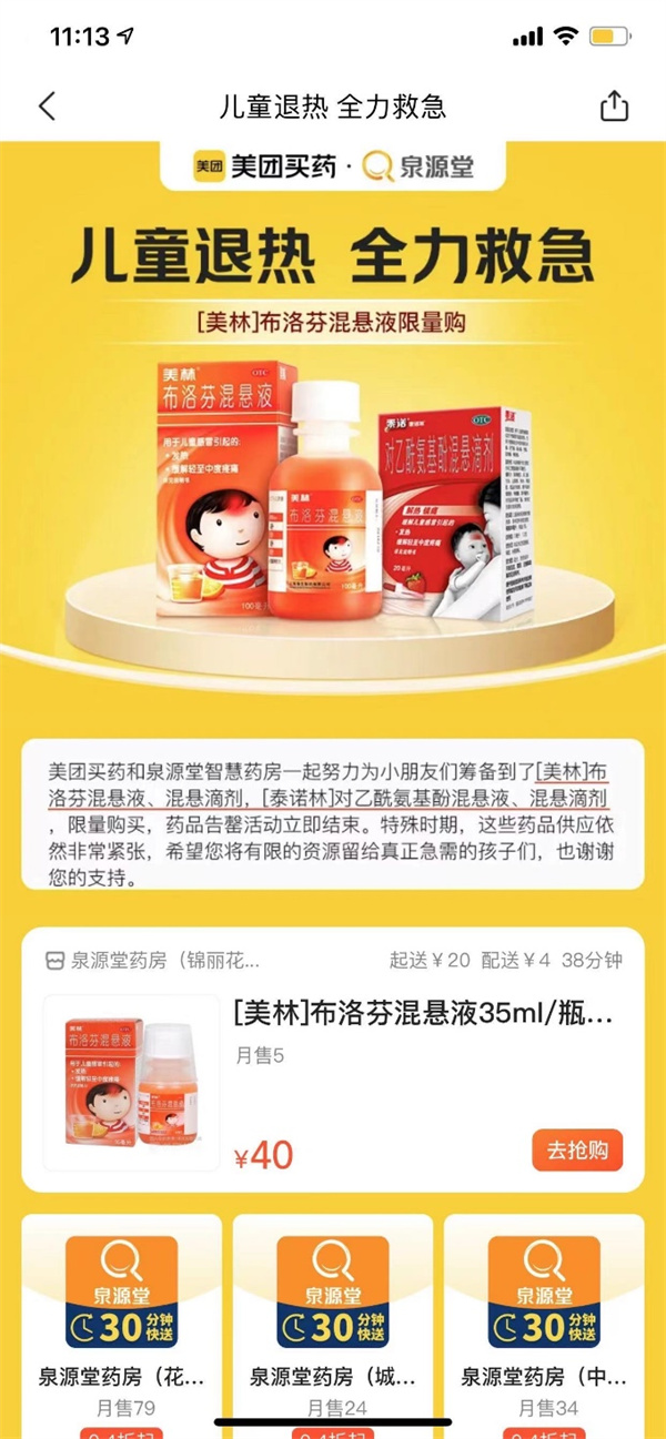 此次美团买药面向成都地区,投放一批平价布洛芬(美林)混悬液、对乙酰氨基酚(泰诺林)等儿童退热药,市民可在美团买药线上下单,药品平均30分钟配送到家。据介绍,该批次儿童退热药供应量超过6000瓶,覆盖成都绝大部分行政区域,确保让更多的市民都能买到。