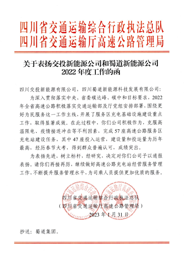 四川新闻网成都2月3日讯 近日,四川省交通运输厅高速公路管理局向蜀道交通服务集团旗下新能源公司发来表扬函,对该公司2022年度在全省高速公路服务区充电桩建设工作作出的贡献表示充分肯定。