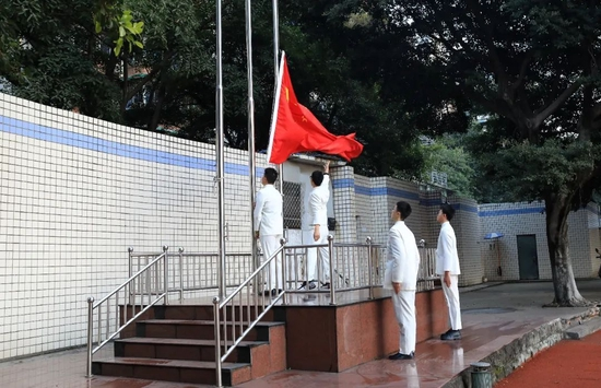 五星闪耀,信仰赤诚!伴随着庄严雄壮的出旗曲,升旗仪式正式开始。国旗队迈着整齐的步伐入场,在全校师生的注目下,旗手振臂一挥,鲜艳的五星红旗徐徐展开、冉冉升起。